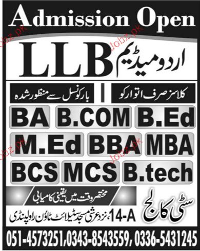 Admission in LLb, BBA, B.Com, B.Ed, MBA, BCS, MBA and B.Tech in City College in Rawalpindi Read newspaper ad for exact details.
