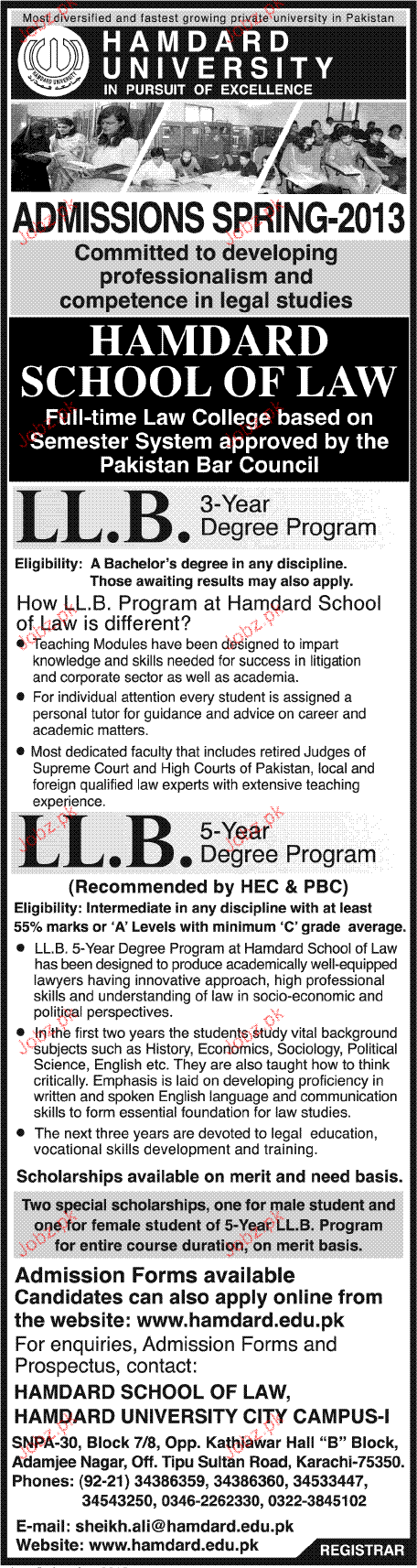 Admission in LLB Hamdard University in Karachi Read newspaper ad for exact details.