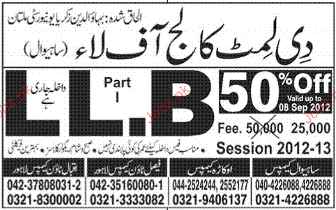 Admission in LLB in The Limit College of Law in Okara Read newspaper ad for exact details.