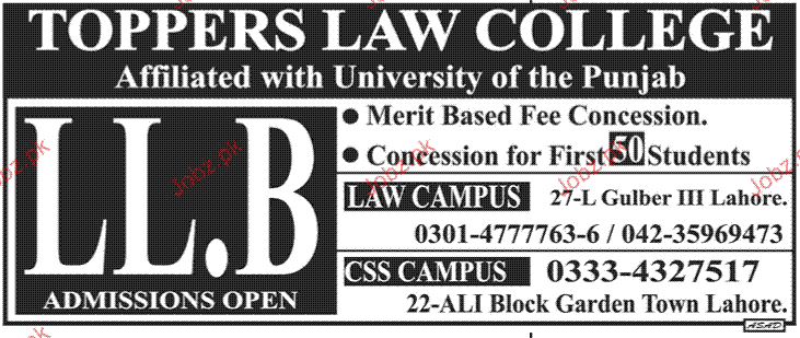 Admission in LLB in Toppers Law College in Lahore Read newspaper ad for exact details.