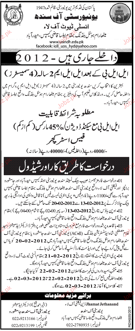 Admission in LLB in University of Sindh in Hyderabad Read newspaper ad for exact details.