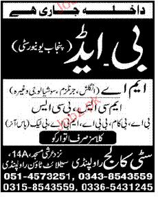 Admission in MA and B.Ed in City College Rawalpindi in Rawalpindi Read newspaper ad for exact details.