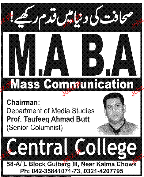 Admission in MA, BA Mass Communication in Central College in Lahore Read newspaper ad for exact details.