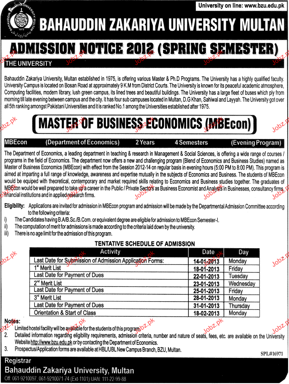 Admission in MA in Economics in Bahuddin Zakariya University in Multan Read newspaper ad for exact details.