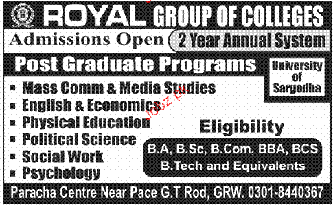 Admission in MA English, Political Sciences, Social Work and Psychology in English in Royal Group of Colleges in Lahore Read newspaper ad for exact details.