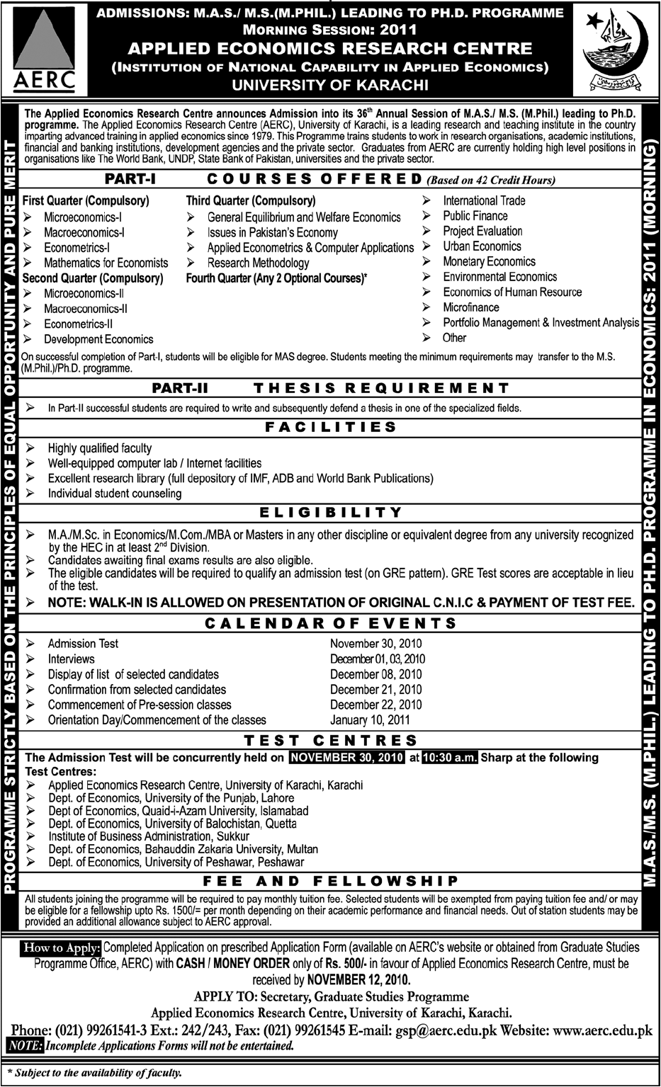 Admission in M.A.S./M.S.M.Phil,PH.D in Institute Of National Capability in Applied Economics,University Of Karachi Read newspaper ad for exact details.