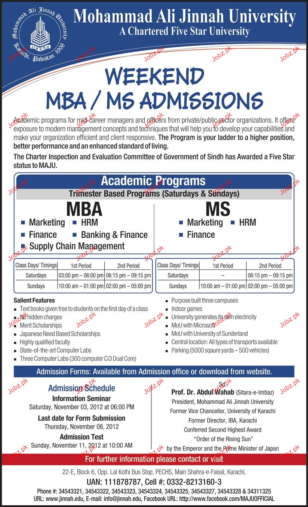 Admission in MBA Marketing, Finance, Banking & Finance, MS HRM, Marketing in Mohammad Ali Jinnah University in Karachi Read newspaper ad for exact details.