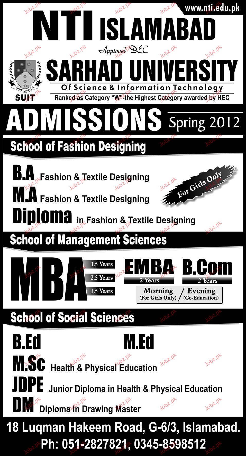 Admission in MBA, BA, MA, B.Ed, MSC and M.Ed in NTI Islamabad Read newspaper ad for exact details.