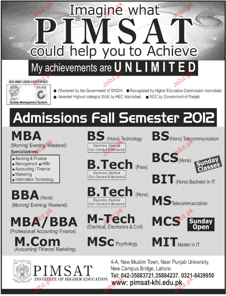 Admission in M.Com. MBA, BBA, BS, MIT, BCS< MSC and BS in PIMSAT Institute of Higher Education in Lahore Read newspaper ad for exact details.