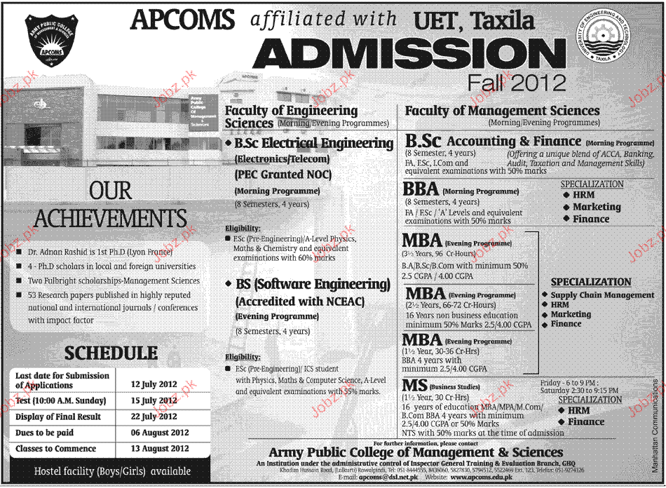 Admission in MBA, BBA in Army Public College of Management Sciences in Rawalpindi Read newspaper ad for exact details.