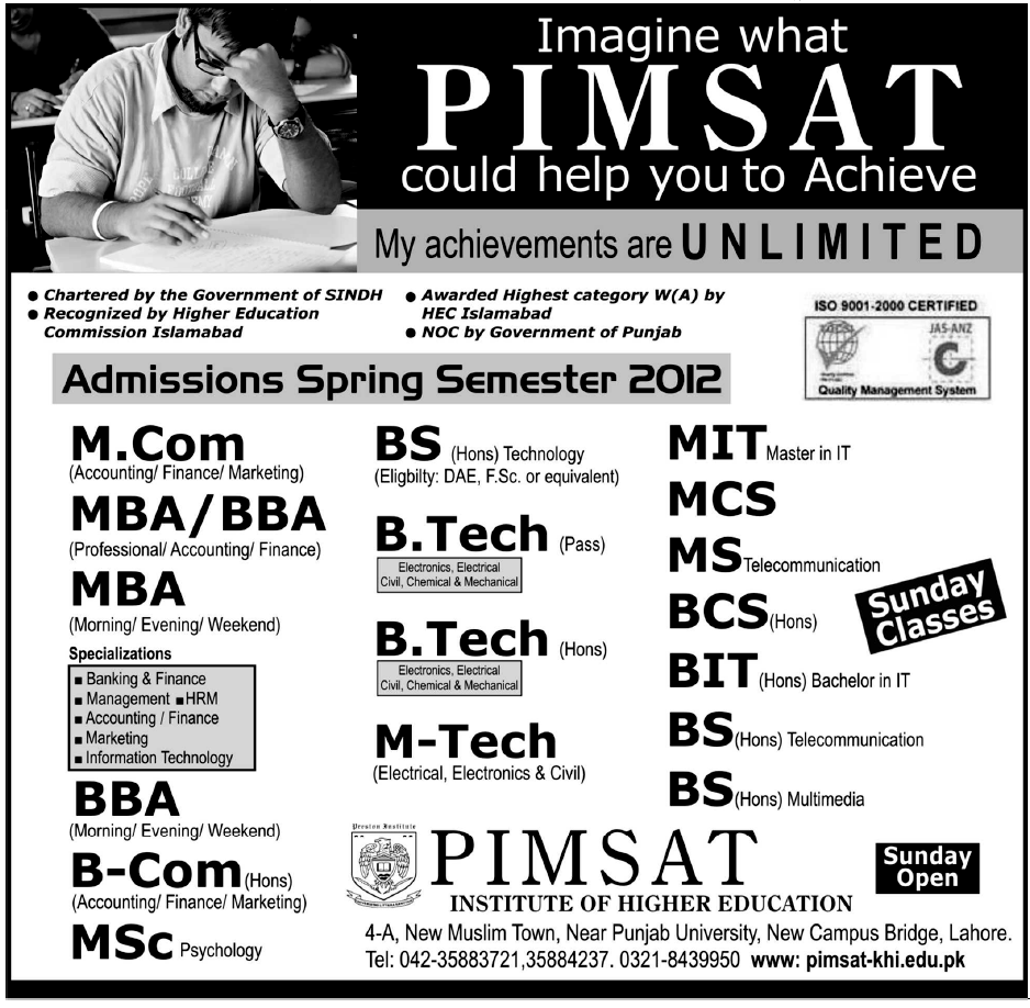 Admission in MBA, BBA, M.Com, BIT, BS and B.Com in PIMSAT Institute of Higher Education in Lahore Read newspaper ad for exact details.