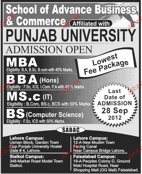 Admission in MBA, BBA, MSC IT and BS Computer Sciences in School of Advance of Business & Commerce in Faisalabad Read newspaper ad for exact details.