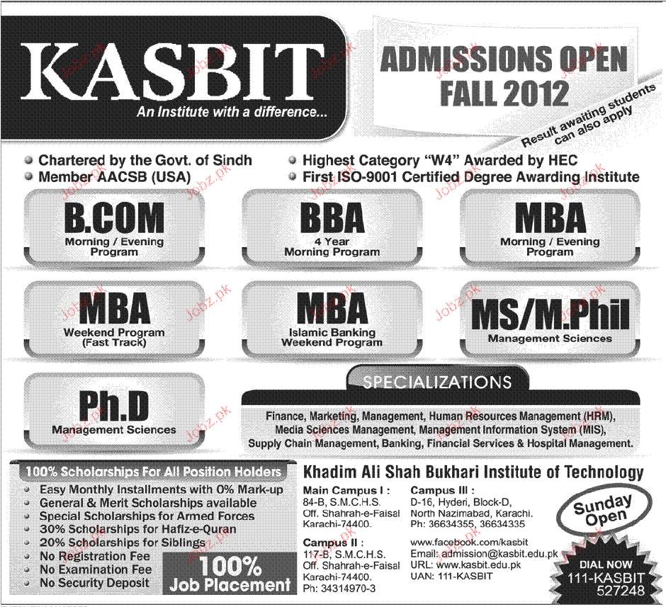 Admission in MBA, B.Com, MBA in Khadim Ali Shah Bukhari Institute of Technology in Karachi Read newspaper ad for exact details.