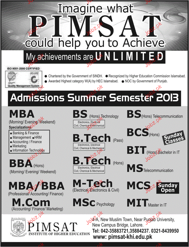 Admission in MBA, BS, BCs, BBA, MIS, MIT and M.Com PIMSAT Institute of Higher Education in Lahore Read newspaper ad for exact details.