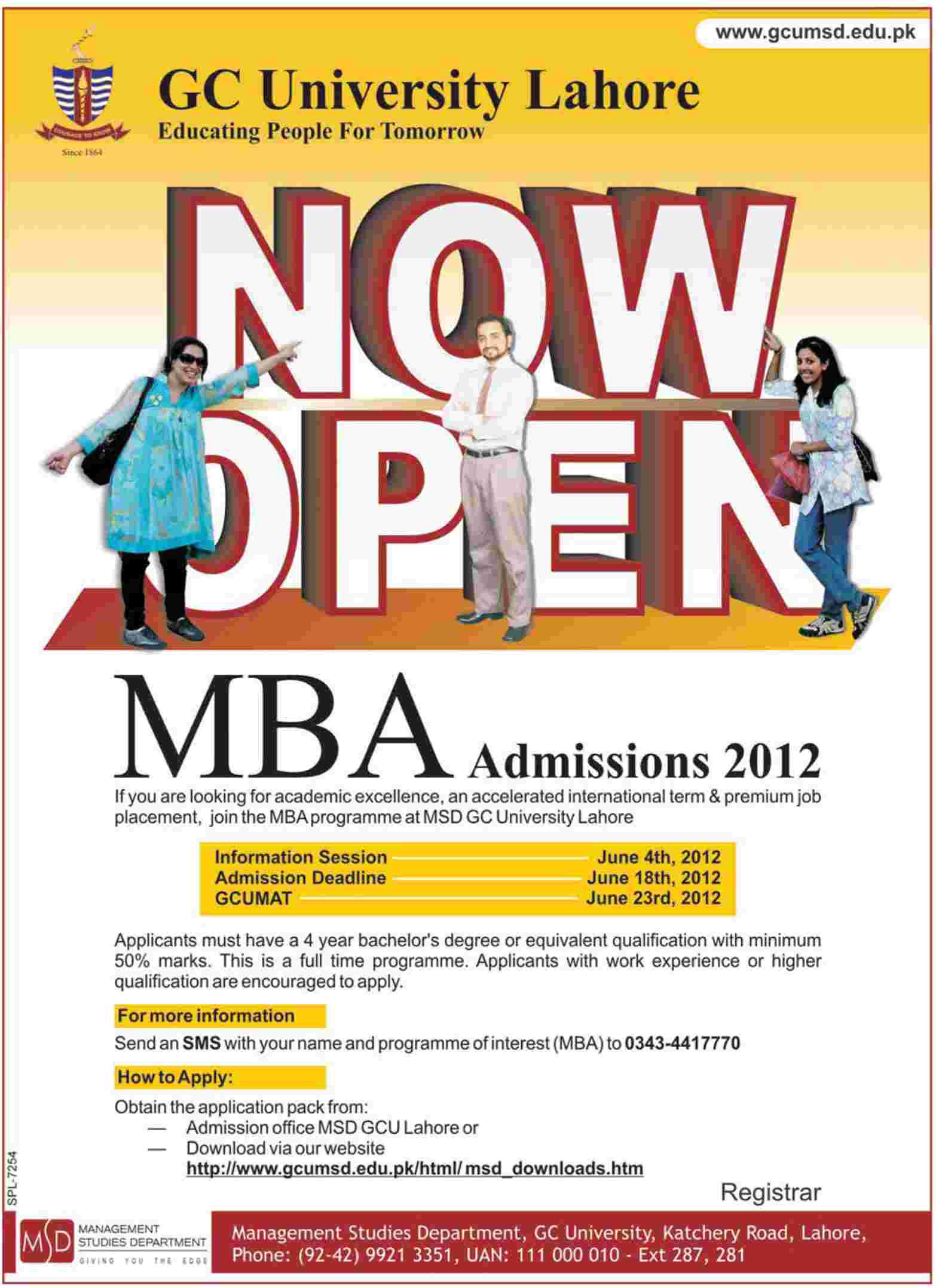 Admission in MBA in GC University in Lahore Read newspaper ad for exact details.