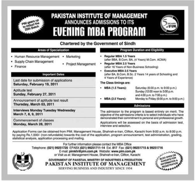 Admission in MBA in Pakistan Institute of Management Karachi Read newspaper ad for exact details.