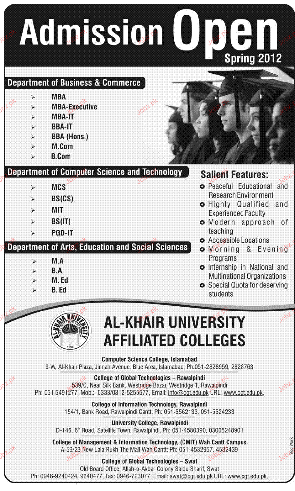 Admission in MBA, MA, MCS, BA and B.Ed in Al Khair University in Islamabad Read newspaper ad for exact details.