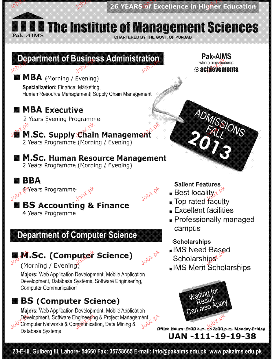 Admission in MBA, MSc, BBA and BS in The Institure of Management Sciences in Lahore Read newspaper ad for exact details.