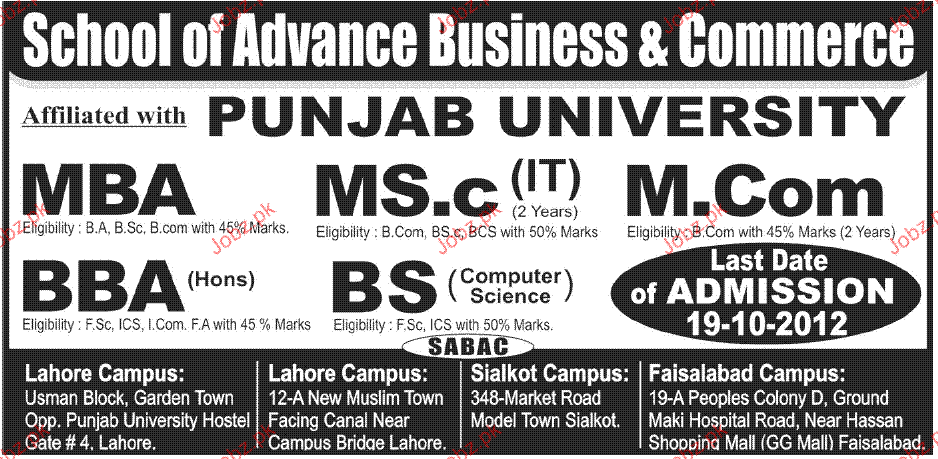Admission in MBA, MSC, BS, M.Com and MSc IT in School of Advance of Business & Commerce in Lahore Read newspaper ad for exact details.
