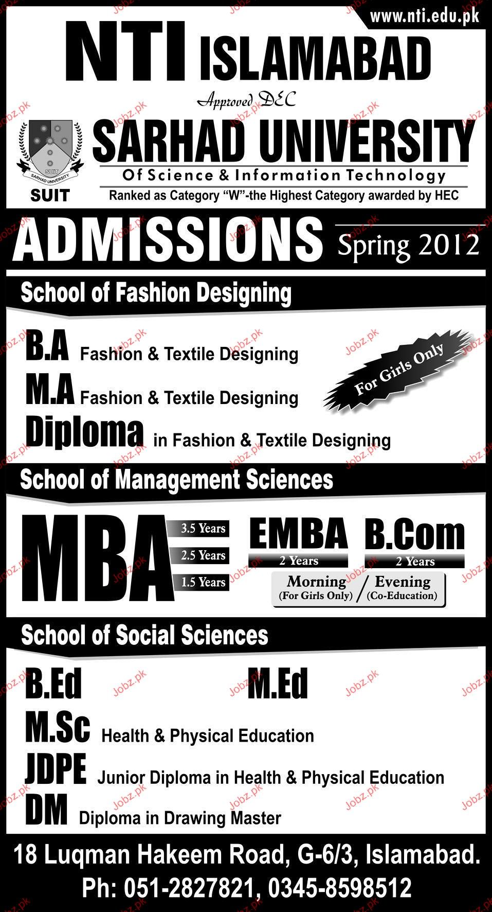 Admission in MMBA, Msc, MA, BA, EMBA and JDPE in NTI Islamabad Read newspaper ad for exact details.