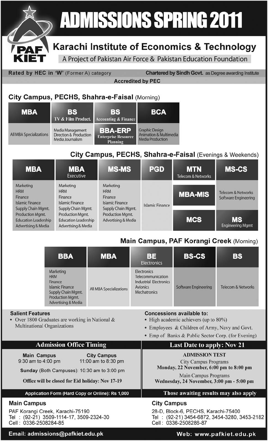 Admission in MBA,BS,BCA,BBA,MS,MCS in PAF,Karachi Institute Of Economics & Technology, Karachi Read newspaper ad for exact details.