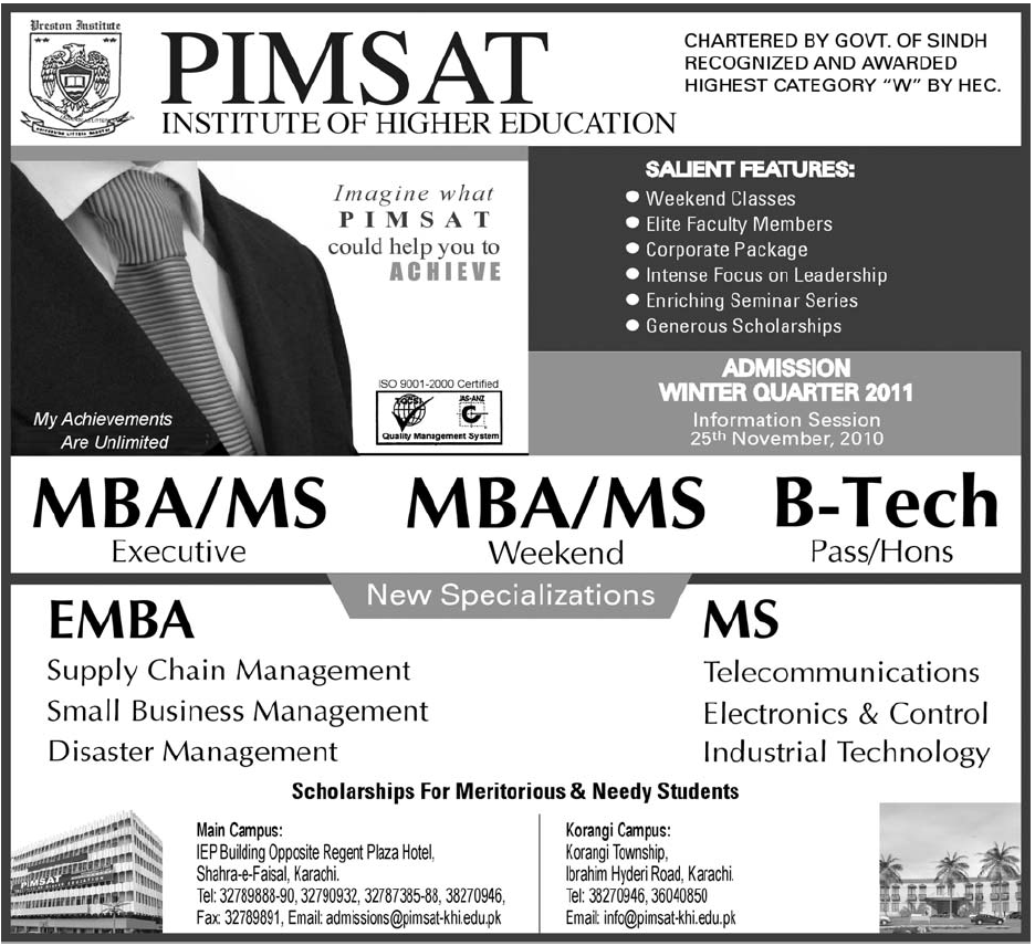 Admission in MBA/MS,EMBA,B.Tech in PIMSAT Institute Of Higher Education Karachi Read newspaper ad for exact details.
