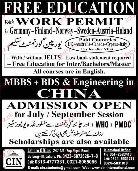 Admission in MBBS and BDS & Engineering in China Read newspaper ad for exact details.