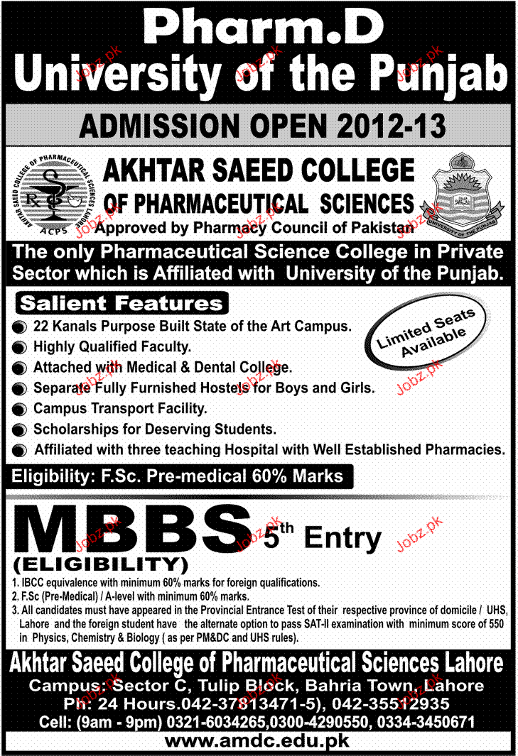 Admission in MBBS and Pharm-D in University of the Punjab in Lahore Read newspaper ad for exact details.
