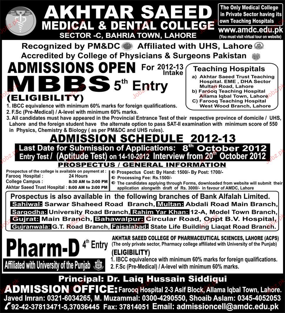 Admission in MBBS in Akhtar Saeed Medical & Dental College in Lahore Read newspaper ad for exact details.