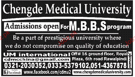 Admission in MBBS in Chengde Medical University in Rawalpindi Read newspaper ad for exact details.