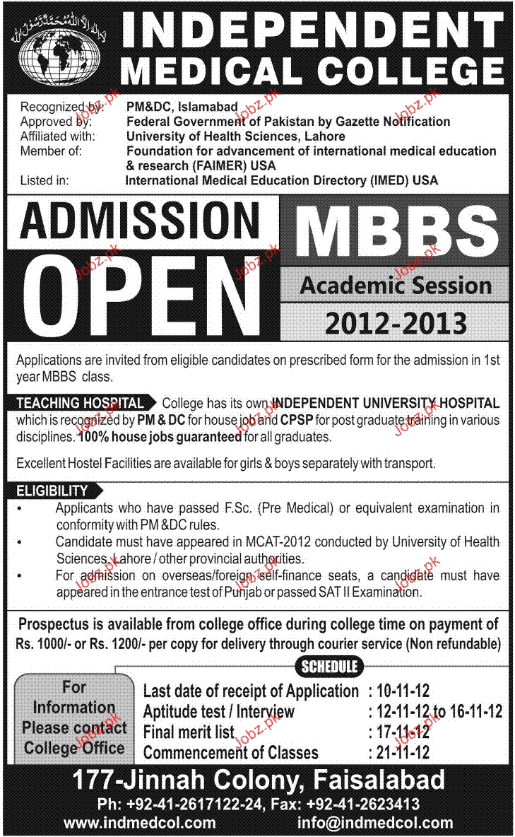 Admission in MBBS in Independent Medical College in Faisalabad Read newspaper ad for exact details.