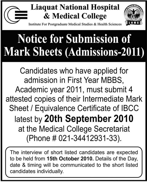 Admission in MBBS in Liaquat Medical Hospital & College.Karachi Read newspaper ad for exact details.