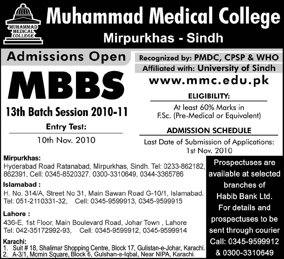 Admission in MBBS in Muhammad Medical college, Karachi Read newspaper ad for exact details.