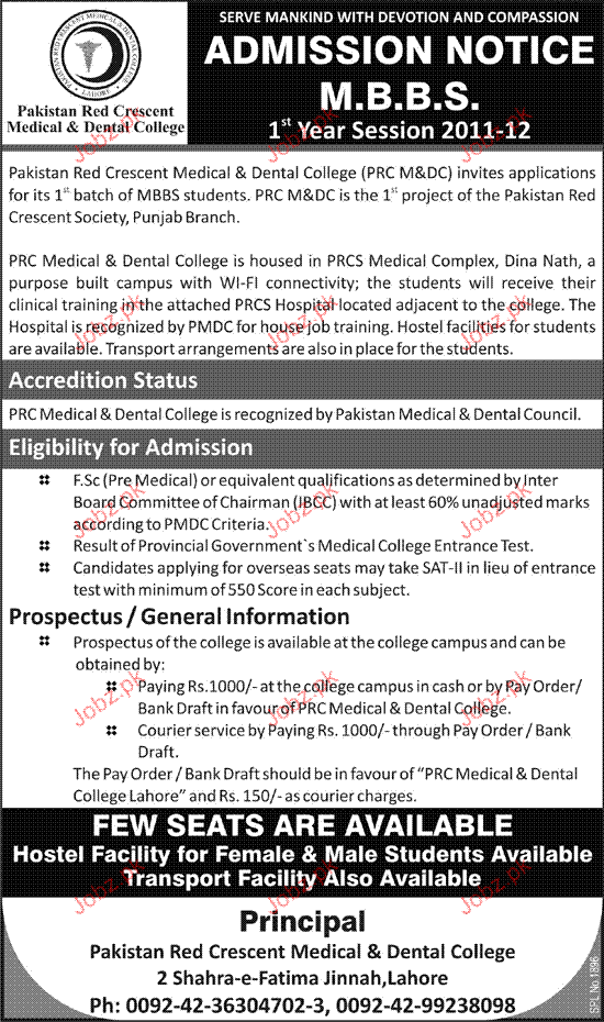 Admission in MBBS in Pakistan Red Crescent Medical & Dental College in Lahore Read newspaper ad for exact details.