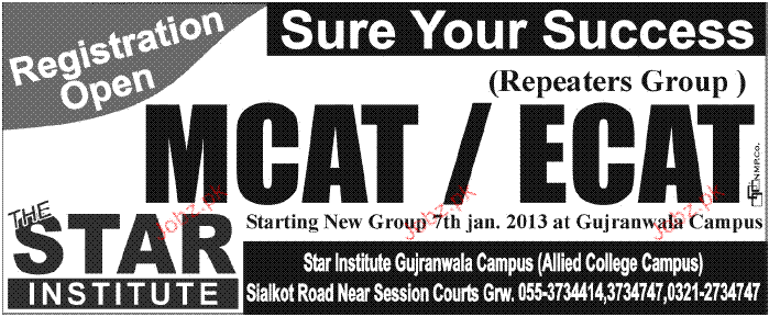 Admission in MCAT / ECAT in The Star Institute in Gujranwala Read newspaper ad for exact details.