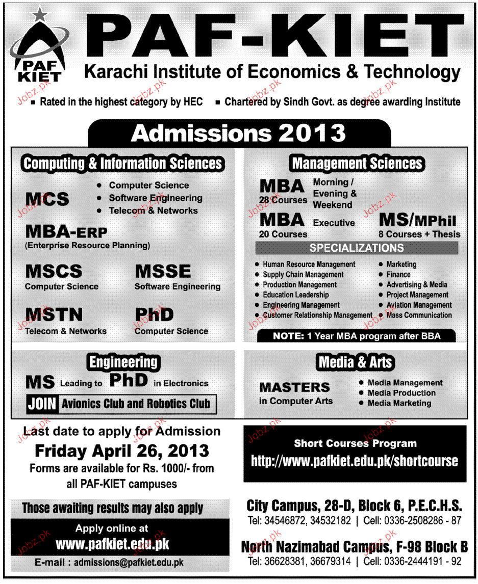 Admission in MCS, MBA, MSTN, MBA and Mphill in Karachi PAF Karachi Institute of Economics & Technology in Karachi Read newspaper ad for exact details.