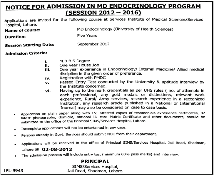 Admission in MD Endocrinology Program in SIMS / Services Hospital in Lahore Read newspaper ad for exact details.