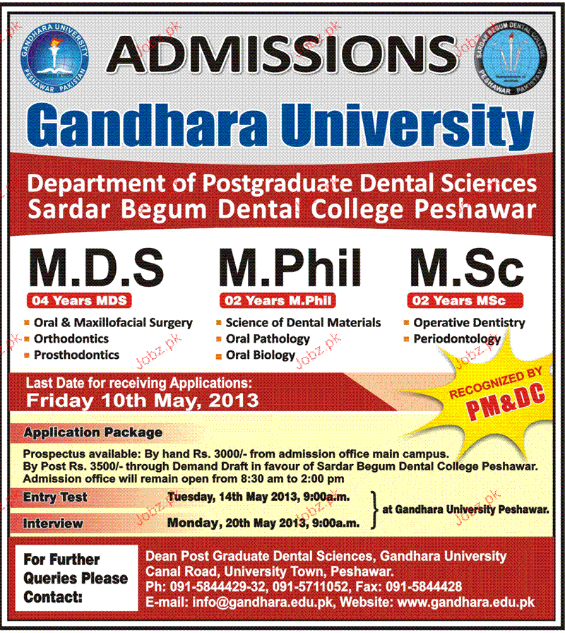 Admission in MDS, Mphill and MSc in Gandhara University in Peshawar Read newspaper ad for exact details.