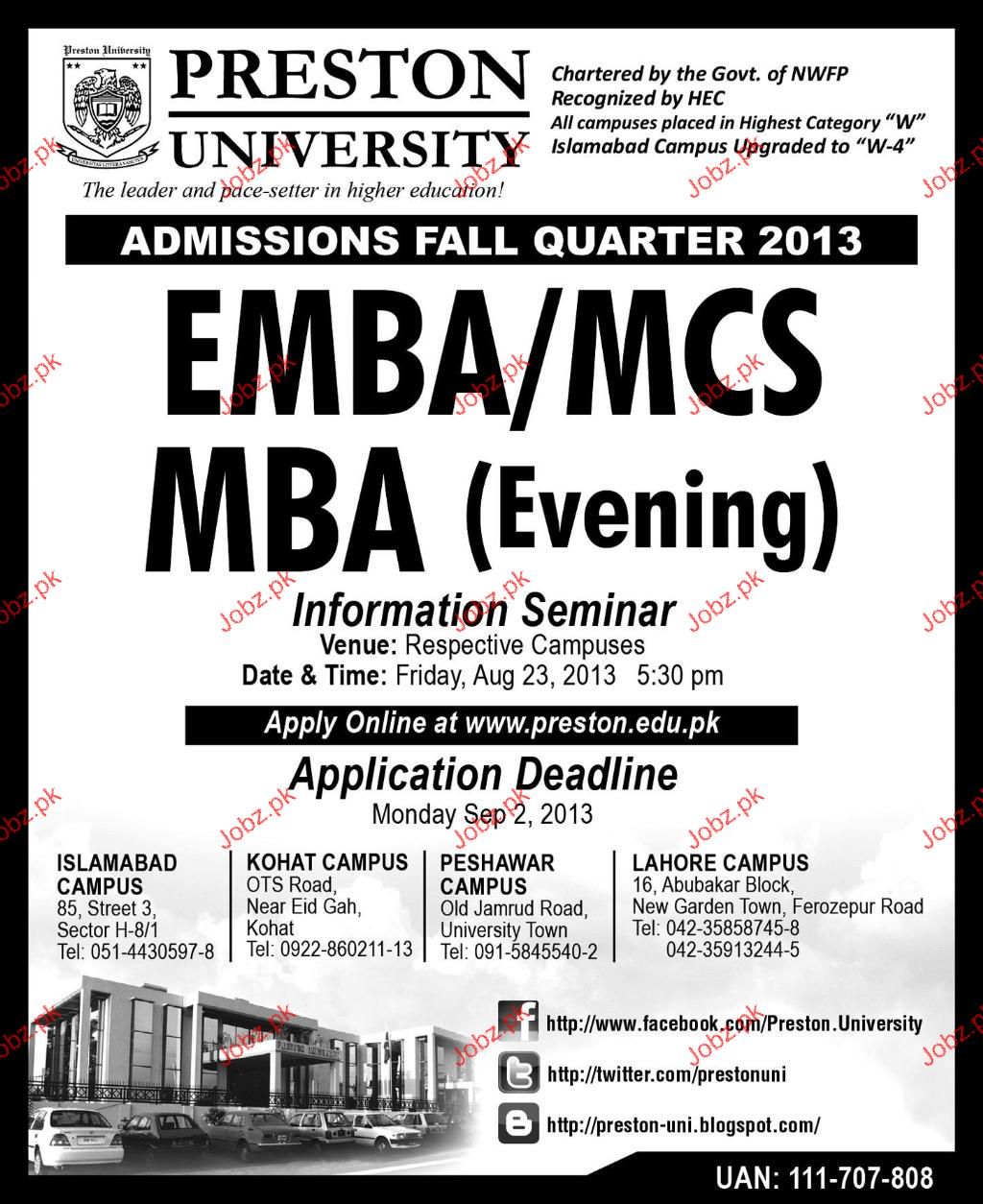 Admission in MEBA / MCs and MBA in Preston University in Islamabad Read newspaper ad for exact details.