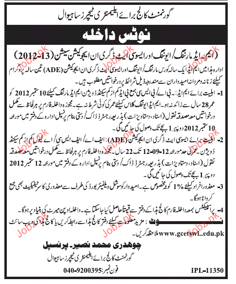 Admission in M.Ed and Associate Degree in Education in Government College For Elementary Teacher in Sahiwal Read newspaper ad for exact details.