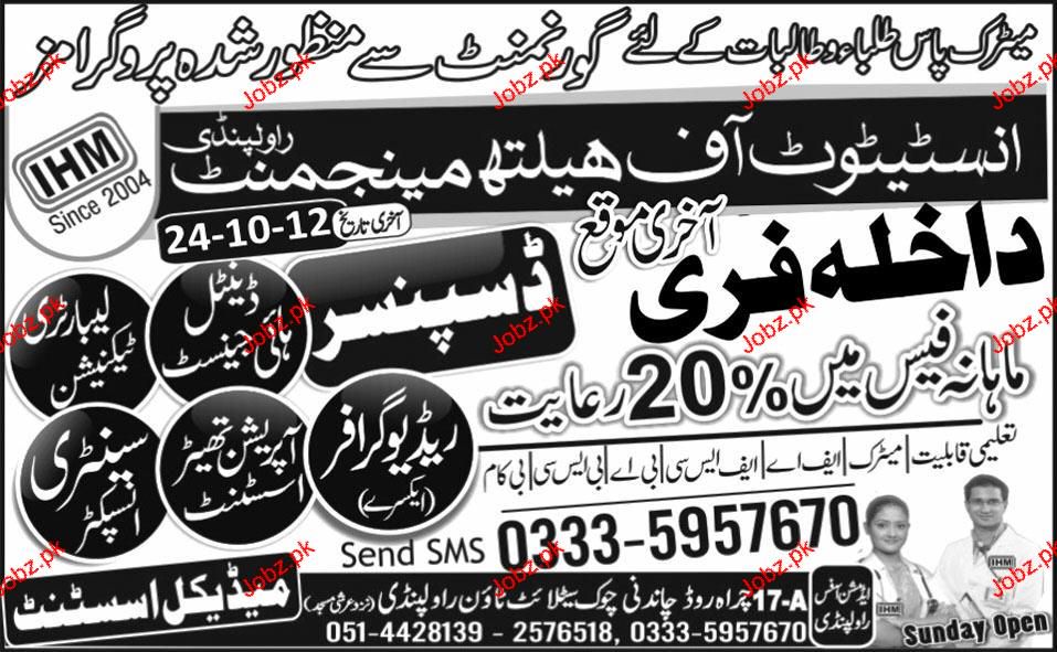 Admission in Dispensers, Dental Hyginest, Lab Technician, Radiographer and Sanitary Inspectors in Institute of Health Management Rawalpindi Read newspaper ad for exact details.