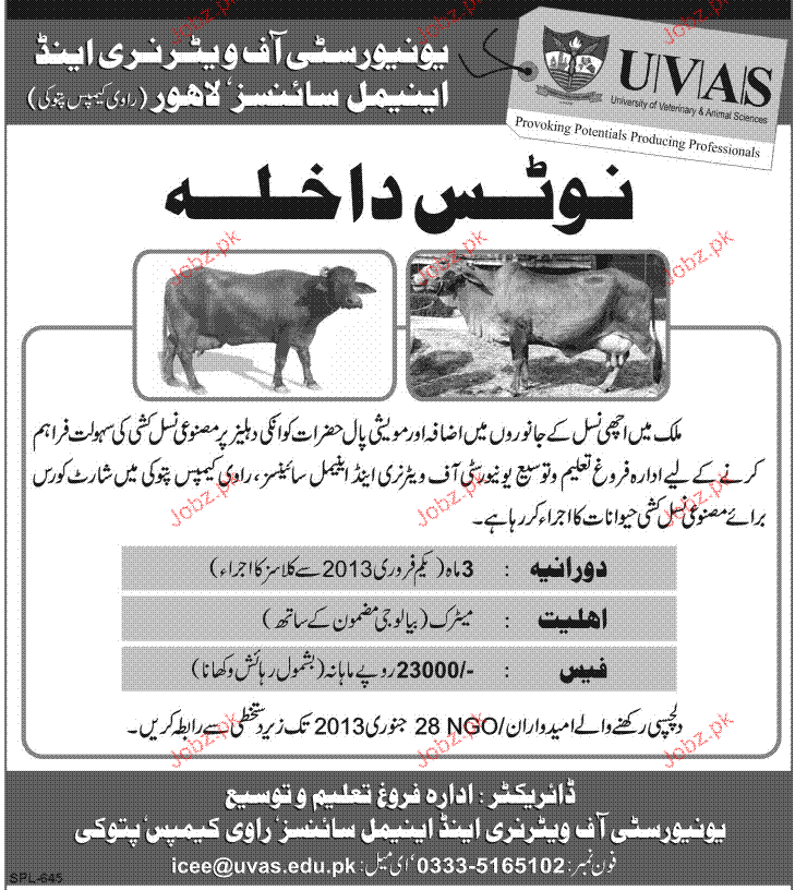 Admission in Medical Courses in University of Veterinary animal Sciences in Lahore Read newspaper ad for exact details.