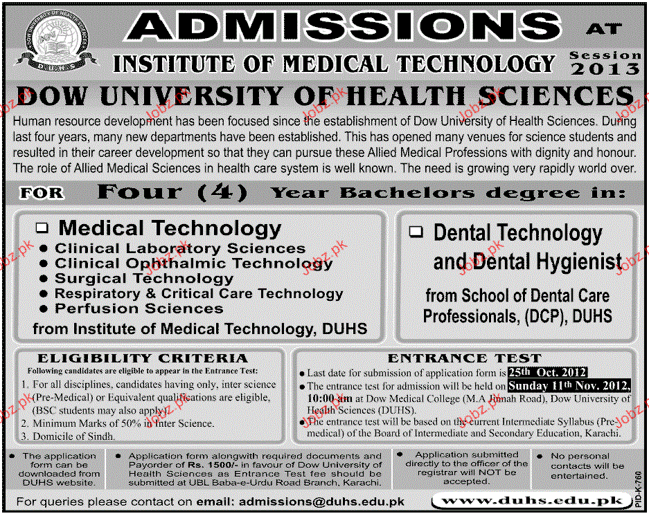 Admission in Medical Technology and Dental Technology in Dow University of Health Sciences in Karachi Read newspaper ad for exact details.