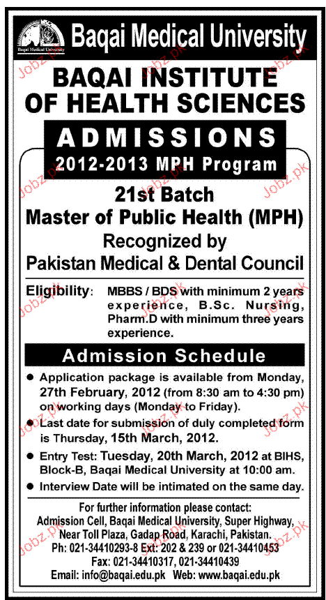 Admission in MPH in Baqai Medical University in Karachi Read newspaper ad for exact details.