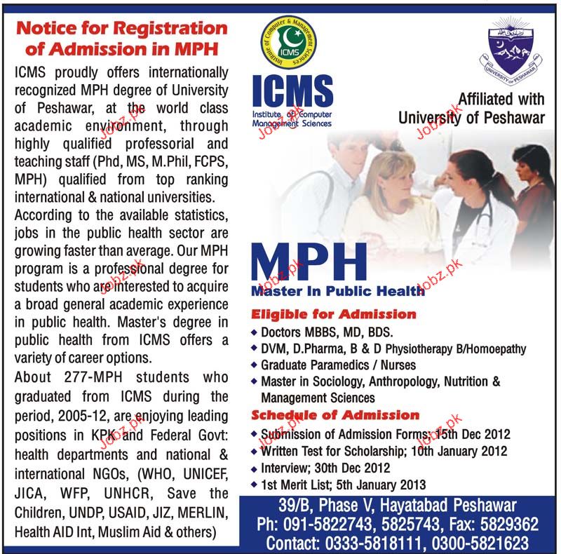 Admission in MPH in Institute of Computer Management Science in Peshawar Read newspaper ad for exact details.