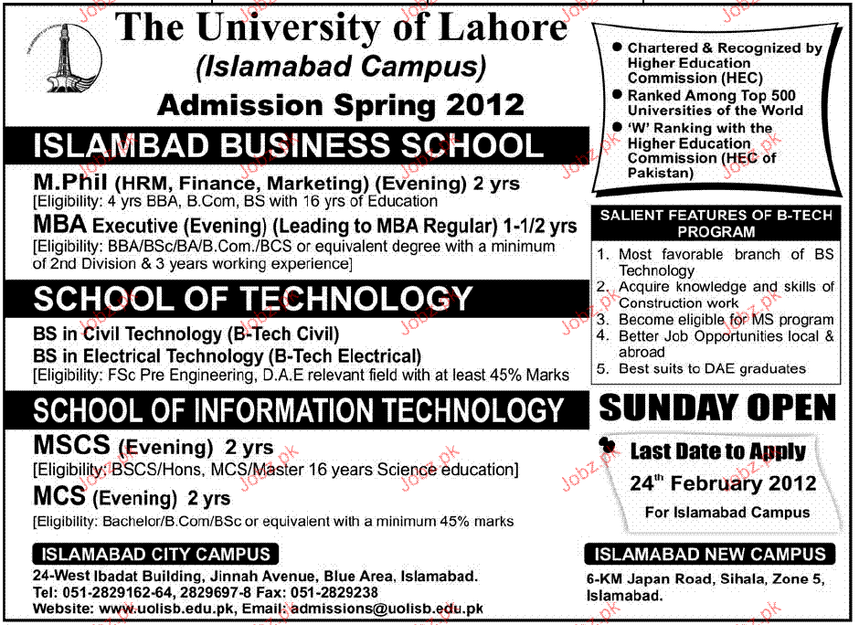Admission in M.Phill, BS & MCS in The University of Lahore in Islamabad Read newspaper ad for exact details.