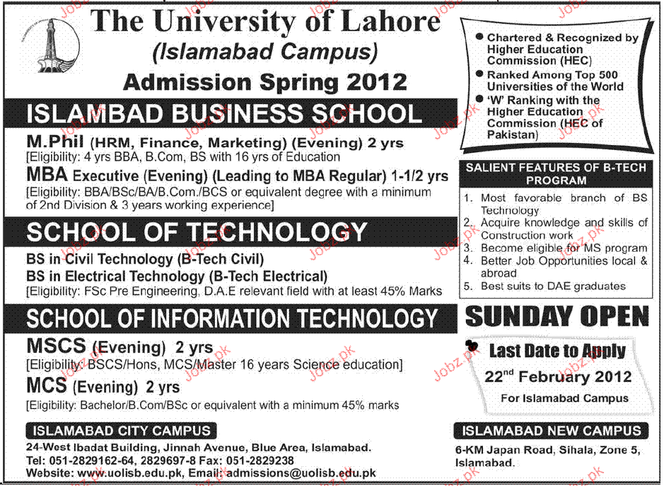 Admission in M.Phill, BS & MCS in The University of Lahore Read newspaper ad for exact details.