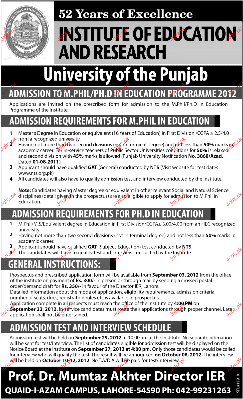 Admission in M.Phill in Education and Phd in Education in University of Punjab in Lahore Read newspaper ad for exact details.