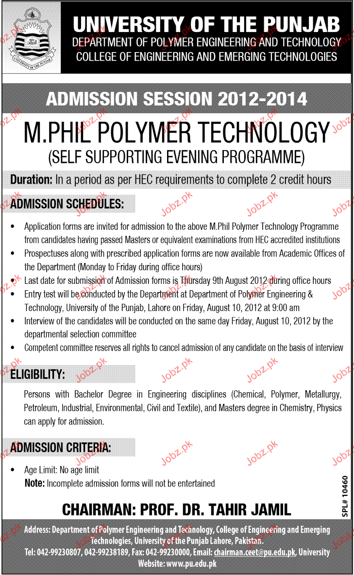 Admission in Mphill in Polymer Technology in University of the Punjab in Lahore Read newspaper ad for exact details.