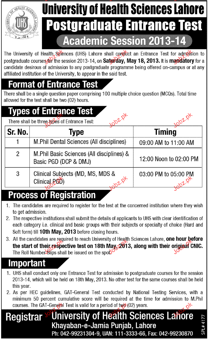 Admission in Mphill in University of Health Sciences lahore Read newspaper ad for exact details.